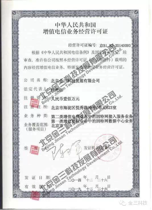 有结果才有发言权,2014年底北京金三科技自己拿到IDC/ISP资质,我们的家人,尤其是龚玲和陈天虹,付出了辛劳,对此提出表扬,加上之前ICP资质的申请, 为公司坚实的基础建设方面有画下浓重的一笔,作为这个市场实力最雄厚的企业,我们将在前面获得主要的市场机会,相信能带给我们家人更多的项目机会。