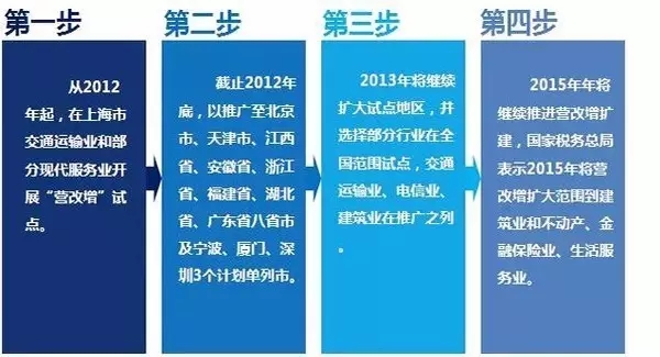 继上海的改革试点后,营改增在更多地区、行业逐步推开。2013年8月1日,交通运输业和部分现代服务业的营改增试点在全国范围内推开;2014年1月1日起,铁路运输和邮政服务业纳入营改增试点,交通运输业至此全部纳入营改增范围。2014年6月1日,电信业也被纳入营改增试点范围。